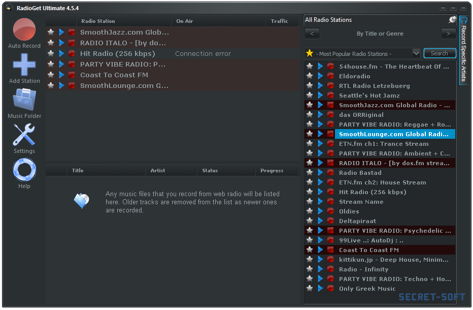 Одна из самых популярных программ для прослушивания радио и записи RadioGet Ultimate. Включает более 25 тыс. постоянно обновляемых радиостанций со всего мира. Позволяет слушать и записывать радио в отличном качестве без ограничений. Все радиостанции сортируются по жанрам, вы можете добавлять их в избранное или записывать отдельные треки.